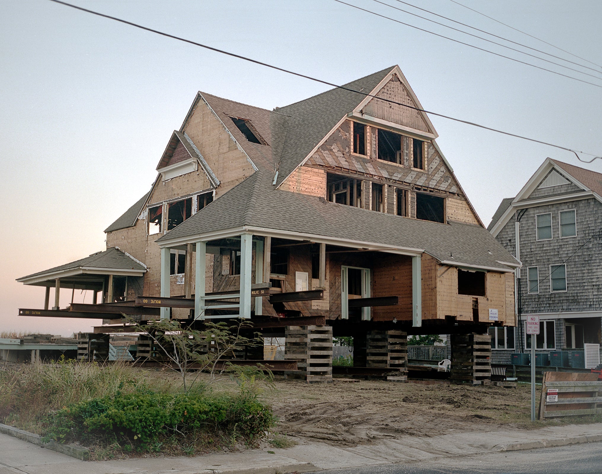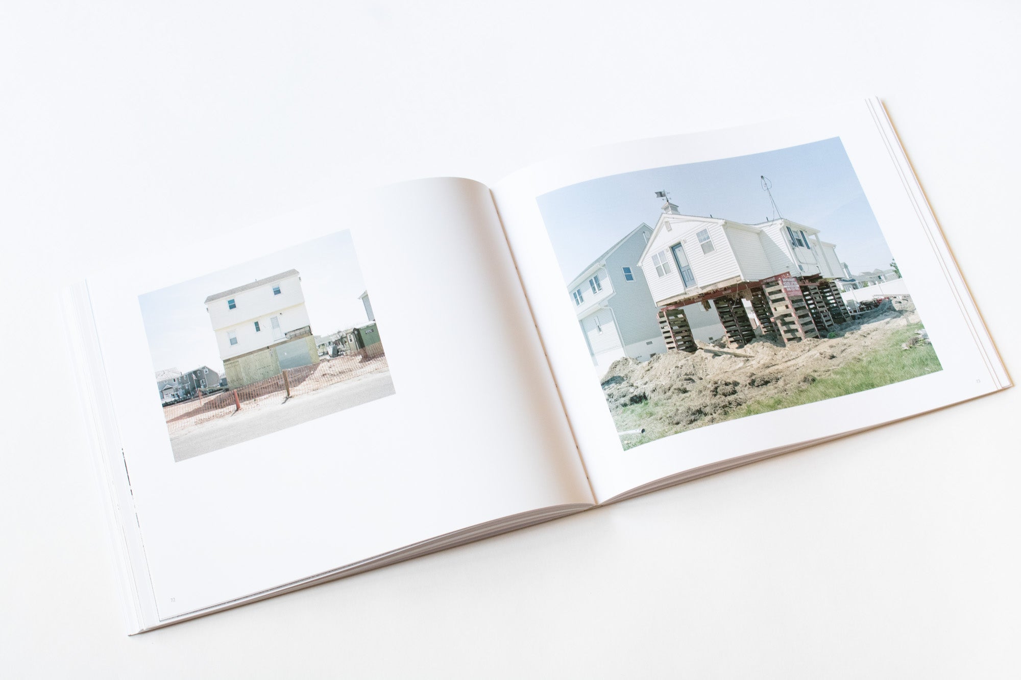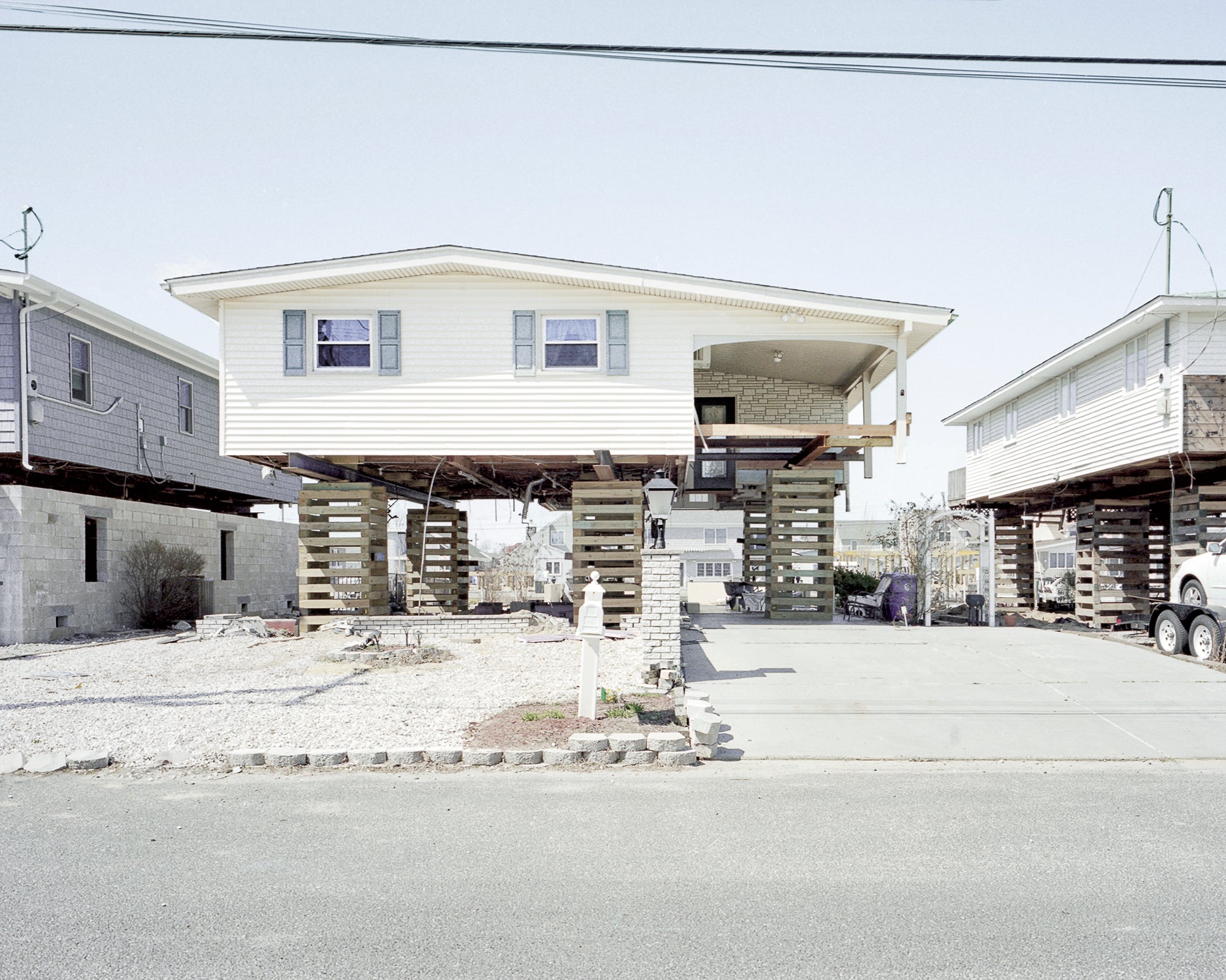 The Jersey Shore was devastated by Hurricane Sandy, and remains under threat from storms, erosion, and rising sea levels. Despite the overwhelming odds, people repair and rebuild their homes on this precarious land using a rudimentary elevation system. Houseraising is a typology of these strange structures, and a harbinger of our increasingly urgent battle with the forces of nature we have unwittingly unleashed.