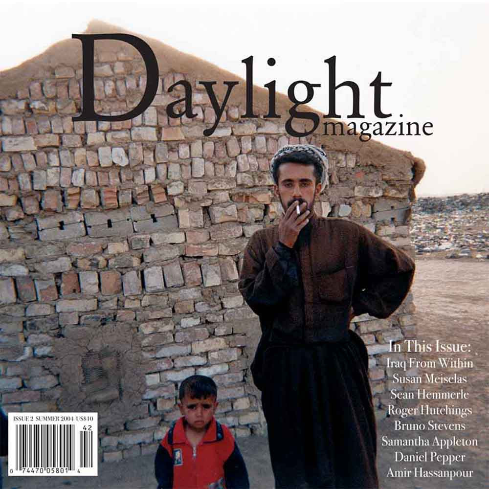 In this issue of Daylight Magazine, Iraq is presented from a number of perspectives. Living far from the front lines, it is the images that we as foreigners see on television and in newspapers that define our perception of the current situation in Iraq. For many of us, this is an armchair war consisting of images released by corporate-controlled media conglomerates and government censors with undeniable agendas. This issue of Daylight presents the work of photographers who have spent time in Iraq working to present their audience with an individual perspective of the region. What a photographer chooses to capture reflects a personal interest or desire to share a very specific moment with the spectrum of potential viewers. Susan Meiselas' images of the Kurdish mass graves in southern Iraq came to light ten years ago when the burial sites were exposed to the world. These images have gained contemporary relevance as they are once again being reproduced and reviewed as evidence in the legal case against Saddam Hussein. Sean Hemmerle's photographs concentrate on landscapes of war-damaged Baghdad. Also featured in the issue is the first appearance of the self-representative photographic project 'Iraq from Within' which later became the travelling exhibition 'Photographs by Iraqi Civilians, 2004'.